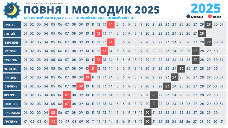 Яка фаза Місяця в кожен день 2025 року вказує календар місячних фаз на весь поточний рік. Також даний місячний календар називає дату, коли настає Молодик, а коли Повня в кожен календарний місяць 2025 року
